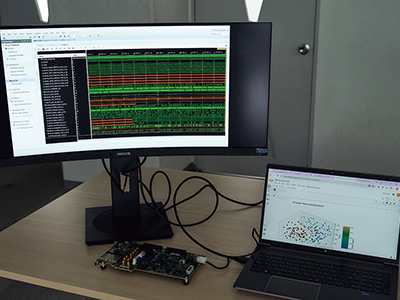 制作した回路が意図した通りに稼働するかをシミュレートした後、ハードウェア(FPGA:論理回路の書き換えが可能な集積回路)に組み込んで動作を検証する。実際の組込みまで行うことで、技術への理解度がさらに深まる