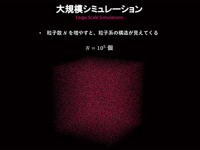「大規模シミュレーション実験として、ある閉ざされた空間に10万個の粒子を入れ、時間の経過と共にどのように変化していくかを観察したことがあります。現実の世界ではとてもできない実験も、コンピュータによるシミュレーションであれば可能です。モニター上で確認したところ、粒子の数が多過ぎるために、当初は霧のようにしか見えませんでした。しかし、しばらく観察していくうちに、ある変化を確認しました。当初は均等に分散していた粒子が、時間の経過と共に偏りはじめ、濃淡が浮かび上がってきたのです。運動方程式の計算に基づく結果が『見える化』されていく過程に目が釘付けになったことを覚えています」