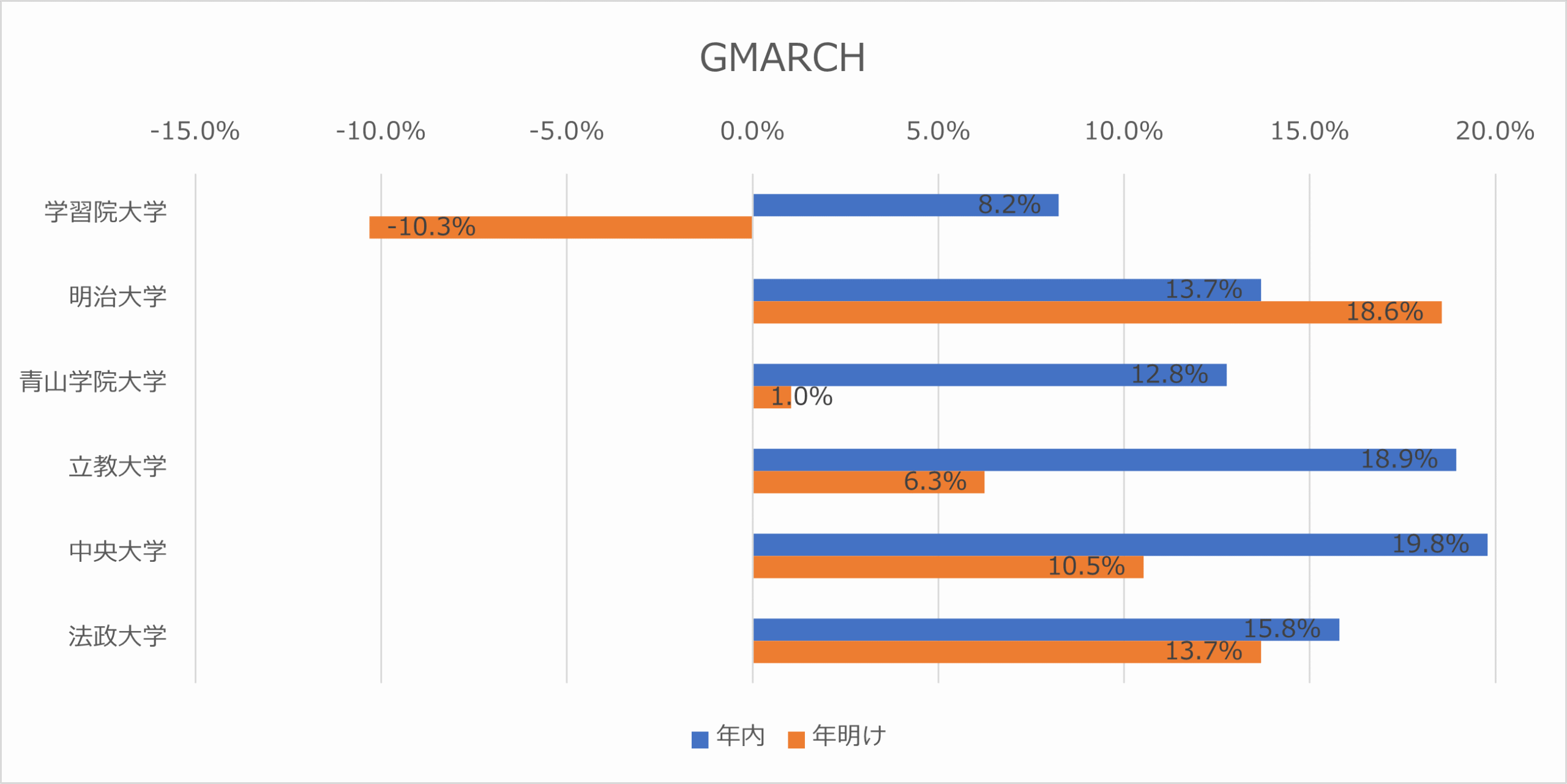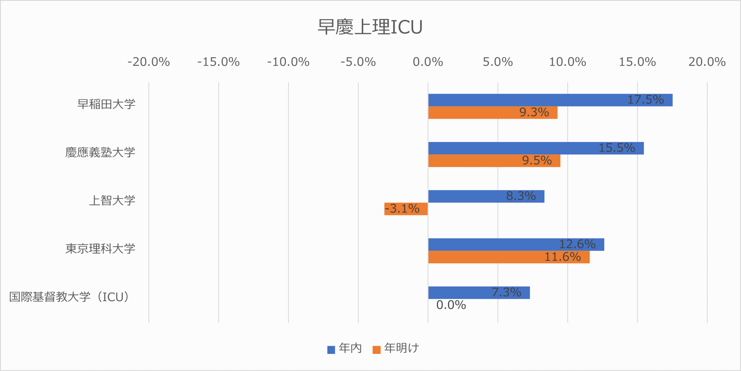 年内 12.4% / 年明け ▲5.6% 受験生は、これらの大学を「年内入試の確実なターゲット」として評価する一方で、年明けの一般選抜については、より上位のGMARCH等へのチャレンジか、あるいはリスク回避のために他校へ分散させている様子が伺えます。