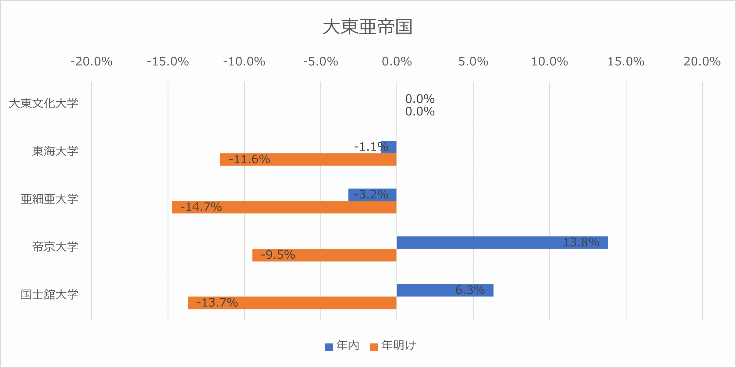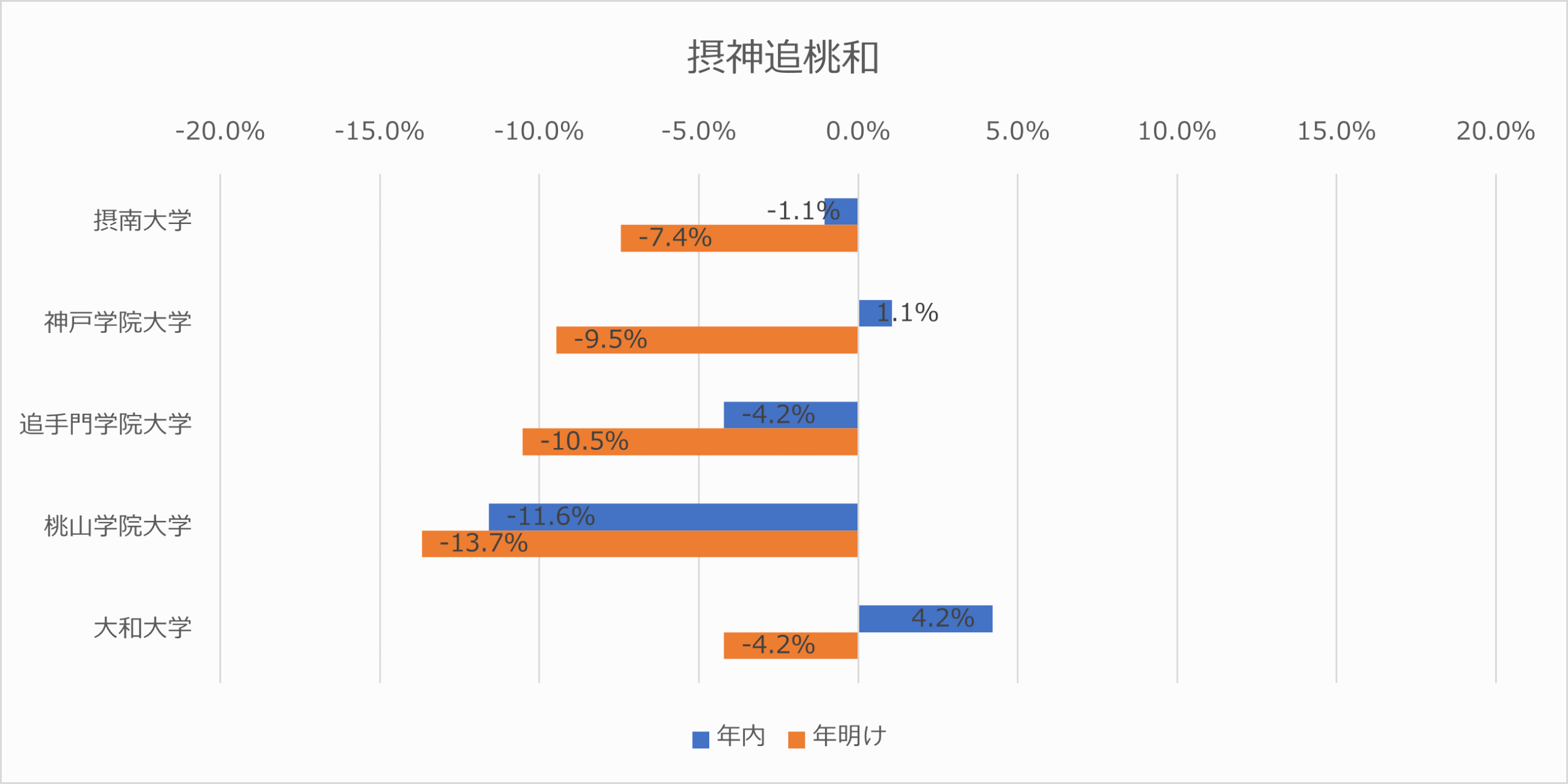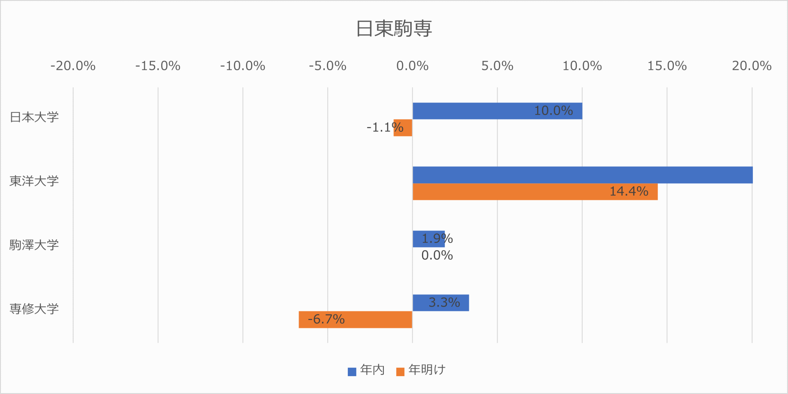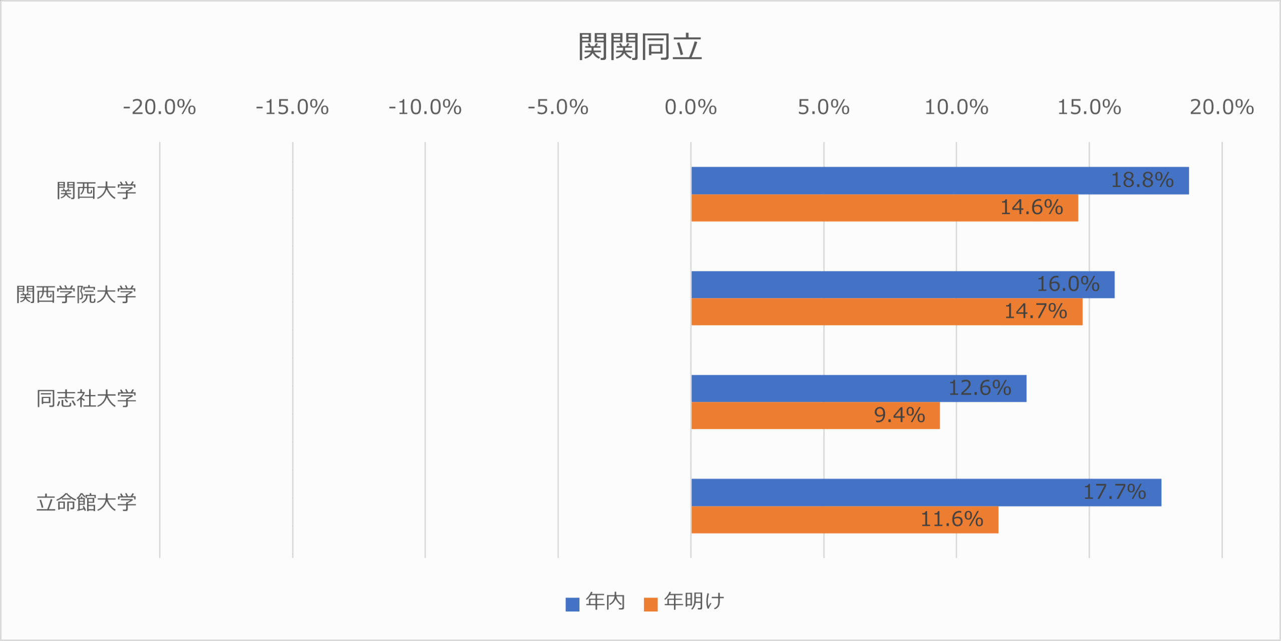 近畿圏では 近畿大学 が年内 20.0%、年明け 9.4%とグループを牽引。一方で佛教大学(年明け ▲11.6%)や京都産業大学(年明け ▲7.4%)はマイナスを記録しており、志願者の「近大一極集中」が進んでいることが見て取れます。