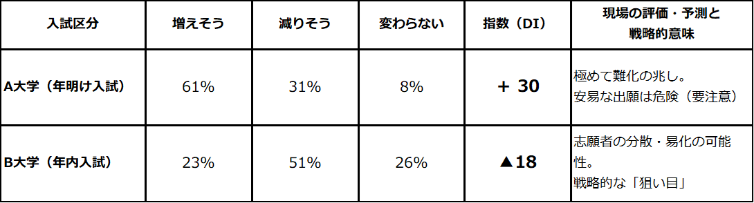 この指標により、単なる「人気・不人気」ではなく、現場の指導者がどれほどその大学の勢いを感じ、生徒に推奨しているかという「期待値」が可視化されます。以下のシミュレーション例は、DIがどのように入試の難易度や戦略に直結するかを示しています。