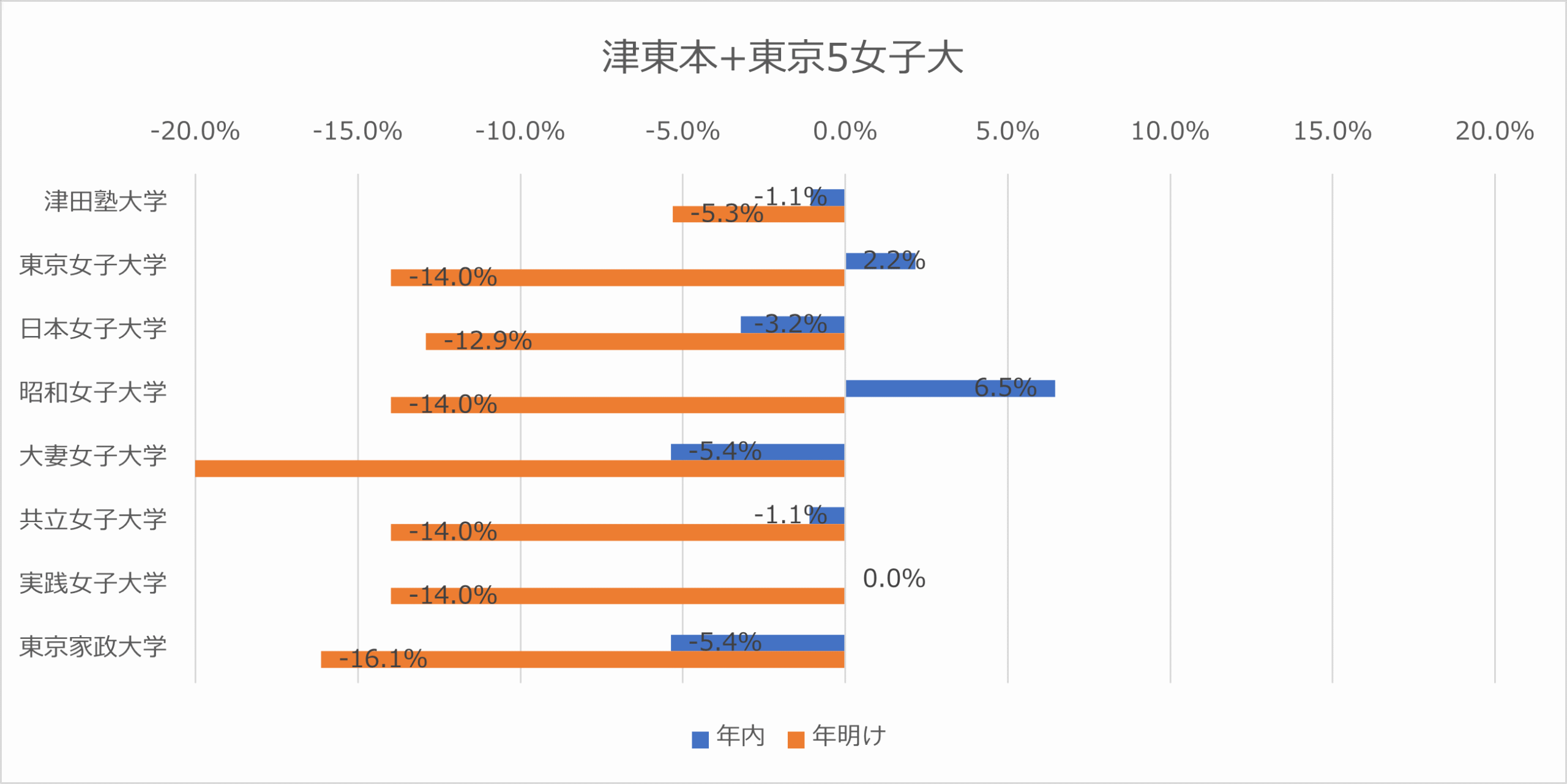 津田塾(年明け ▲5.3%)、日本女子(年明け ▲12.9%)、東京女子(年明け ▲14.0%)に加え、大妻女子(年明け ▲21.5% )や東京家政(年明け ▲16.1%)の落ち込みは深刻です。共学志向へのシフト以上に、一般選抜において「女子大を併願先とする」受験生が激減している、現場の危機感が数字に現れています。